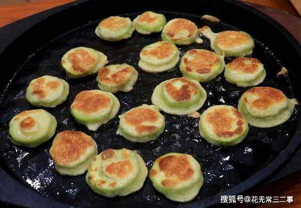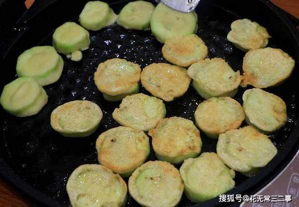3.电饼铛预热3分钟,均匀淋上植物油,把裹好面糊的茄子逐个放入锅中,盖上锅盖烙2分钟,面糊全部定型以后把茄子翻一下面,翻过来之后,在上面均匀淋上植物油防止烙糊,盖上锅盖再烙2分钟,烙至底面呈金黄色时再次翻面。
