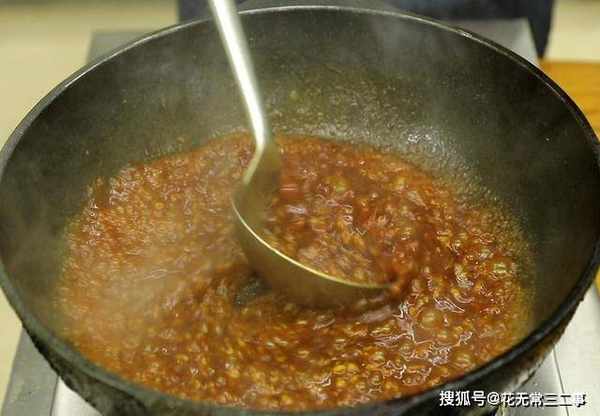4.锅热烧油,充分润锅以后,倒出热油加入凉油,热锅凉油炒肉末时不易粘锅,倒入肉末快速炒散,煸出里面的猪油,这样成菜吃着更香,肉末炒至微微干香以后,放豆瓣酱炒化、炒出红油,倒入蒜末炒出香味,淋入料酒去腥,倒入调好的料汁,大火多咕嘟一会儿熬出香味,勾入少许水淀粉,把汤汁收浓即可出锅。