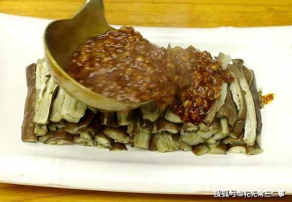 5.这时茄子也蒸好了,把给它取出来,稍微晾凉一点下手撕成长条,用手撕出来的茄子,表面不平整更容易吸收料汁入味,把熬好的汁往上一浇,再撒上葱花、小米椒圈即可。