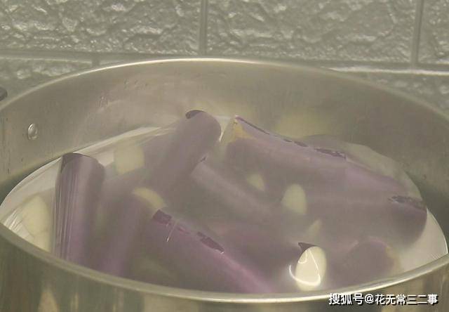 2.锅里烧水,加入少量白醋,加白醋是为了防止茄子变黑,水开后把茄子倒入锅内,焯水1分钟,捞出茄子控干水分。
