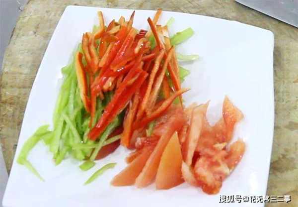1.准备青茄子一个,去蒂削皮,切成丝后泡在水里,以免茄子氧化变黑。西红柿半个切成小块,青椒红椒各一个,去籽切成丝。再切点蒜片、葱片放在一起,再抓一小把红干椒备用。
