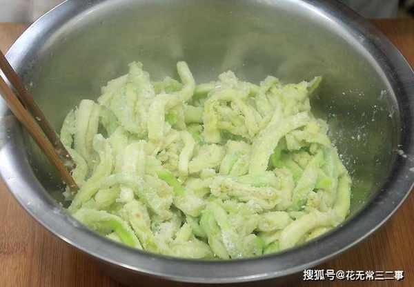 4.8分钟以后,把蒸熟的茄子取出来倒入盆中,用筷子快速抄散,以免坨块粘在一起,撒入适量的食盐,淋入一点香油,翻拌均匀后即可食用。