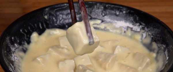 4、另取一个小碗,放入30克白糖、适量白醋、番茄酱,再加入少许生抽、淀粉,加适量水,加入面粉,搅拌均匀,定型搅拌均匀后备用。把我们焯好的豆腐放在碗里,裹上一层面糊,包好面糊后放在一边。