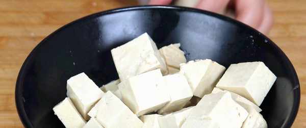 2.豆腐切小块。豆腐块的大小约为2×2厘米。不要让它们太大或太小。豆腐切好后,我们将其放入碗中,然后在锅中烧开适量的开水,将豆腐放入锅中焯一下,这样可以去除豆腥味。两分钟后,取出水,放入备用。