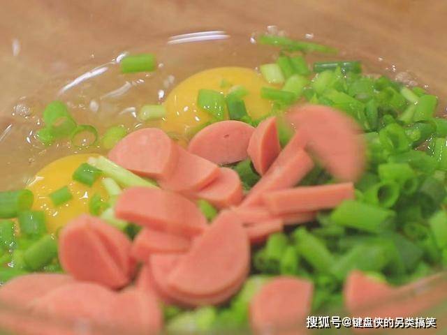 打入三个鸡蛋;一把小葱切成葱花;一根火腿切成薄片