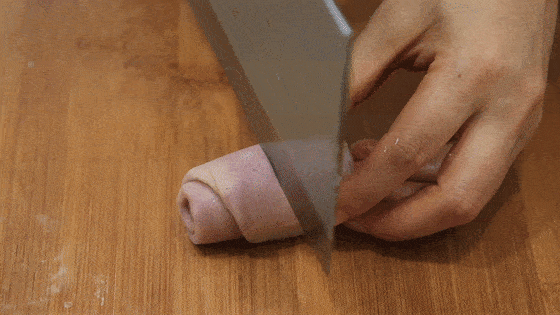 按着视频上面的方法 ,擀过一遍以后, 再擀一次, 卷一次,这一次卷过以后, 用刀切开 一分为二用手再按一下, 用擀面杖擀成一个小圆片 。