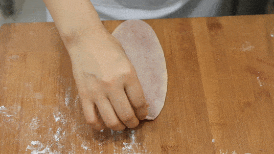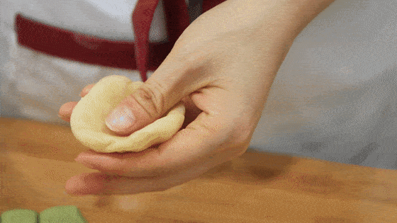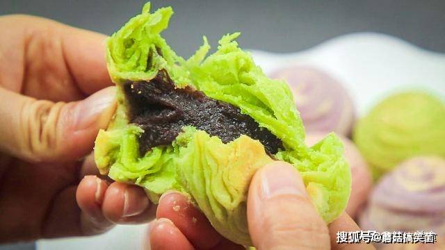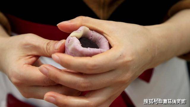 然后用油皮包住油酥,收口时收结实包圆一点,照着视频中这个包法,把每个色彩的油酥都包完。