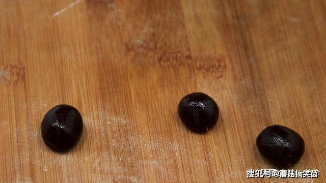 盖住保鲜膜松驰10分钟,这段时间,我们取出一点红豆沙 ,团成豆沙圆球 ,每一个在25克左右。