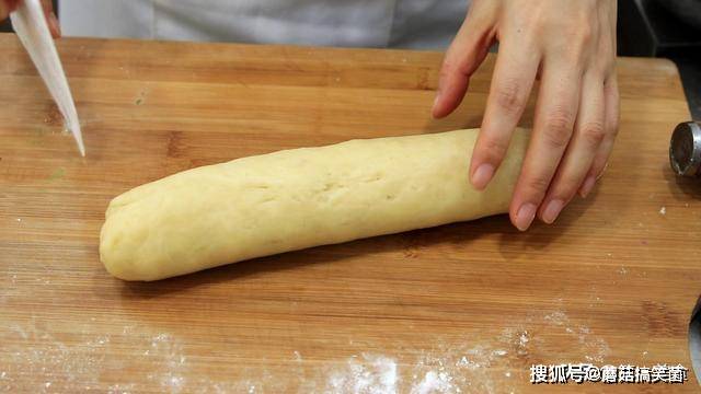之前的油皮松驰了10分钟后,取出油皮揉光滑,搓成粗条 ,切成12个大小均匀的小面剂子,接下来把每个油酥也搓成条, 切成4个均匀的剂子。
