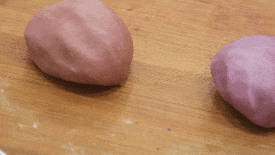 然后用手把油皮团一团、揉一揉 ,最后揉均匀,揉成紫红色的油酥团,接着再把红色和绿色的油酥团也揉好,色彩揉均匀 。