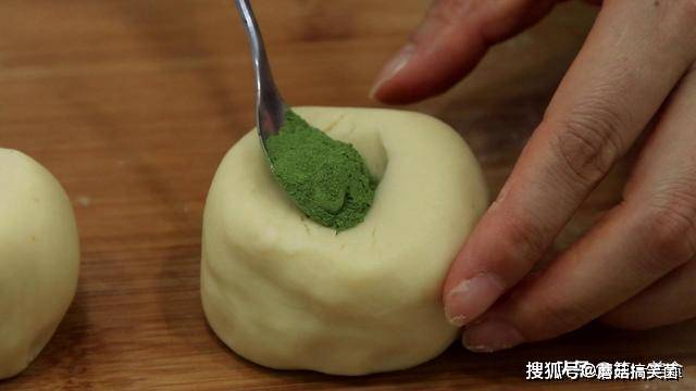 把和好的油酥切成三等份,用勺子在三个油酥的最上面分别按一下 ,按上一个窝,分别倒上 绿色的菠菜粉,紫红的紫薯粉和暗红色的红曲米粉。