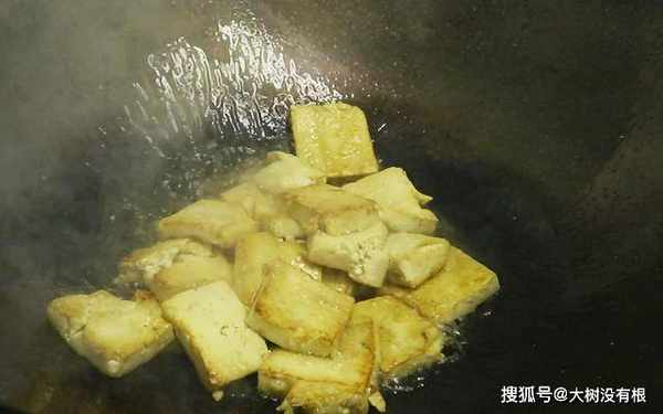 小白菜切成段,豆腐切成厚片。起锅烧油,油热放入豆腐慢慢煎,一面煎黄翻面,煎制两面金黄舀进去两勺水,烧开以后倒出来。