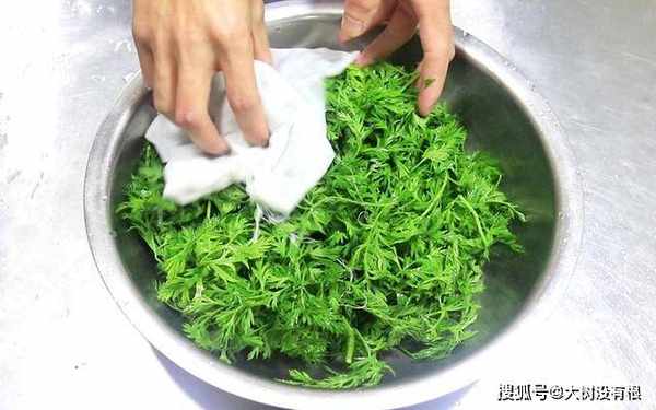 把胡萝卜缨先择一下,把上面的叶子掐下来,放入盆中,加入清水淘洗干净。找一块干净的棉布或者吸水纸,把胡萝卜缨上面的水分擦干。
