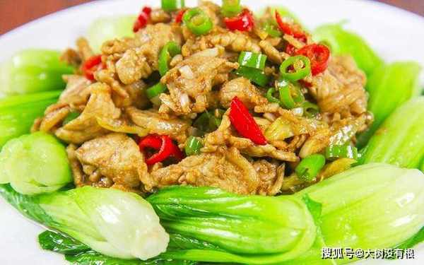 准备上海青一把清洗干净。猪肉一块,顶丝切成片,放入盆中。加入食盐、胡椒粉、料酒、老抽,快速的搅拌均匀。再倒入一小勺植物油,