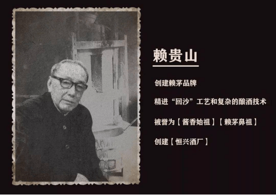 此酒产自贵州怀仁,源自于茅台镇恒兴烧坊创始人赖嘉荣,在1902年独创了酱酒的“回沙工艺”,因此被人们誉为“酱香始祖”“赖茅鼻祖。”