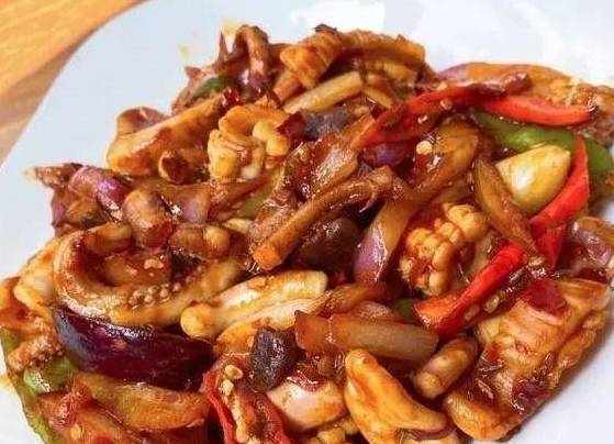 切洋葱,备好配菜,大蒜我没有切开,喜欢爆炒蒜口味的切开更入味。我用来提香。鱿鱼备好划刀,切段。,讲真,很久以前我以为鱿鱼炒完了自己会变成这样……………起锅,水开后放入切好的鱿鱼,变卷后差不多就可以捞出来了。这个过程却是很快!焯好的鱿鱼备用。自家吃,就切稍微细一点。一整条鱿鱼啊!就出一小盘,饭店真的不敢太便宜,要不然就是爆炒洋葱配料鱿鱼……讲述一个事实。。。起炒锅,比平时炒菜多一些油,五分热就把豆瓣酱和蒜放进去,炒出香味。鱿鱼快速上色,加入配菜。小米辣根据口味来定量。这一盘没个五六十真不卖!量又大味道又好~主要还干!干!净!净!配上一碗米饭,我管你是一人食还是二人餐,一顿爆吃就对了!香辣萝卜干