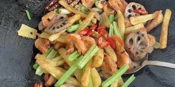用料虾半斤大概20只;莲藕1节;香芹2棵;土豆1个;蒜瓣10瓣;姜片20片;花椒20粒;辣椒干10个;新鲜泰椒3只;生抽1勺;蚝油2勺;盐3克;料酒3勺;孜然1/3勺做法