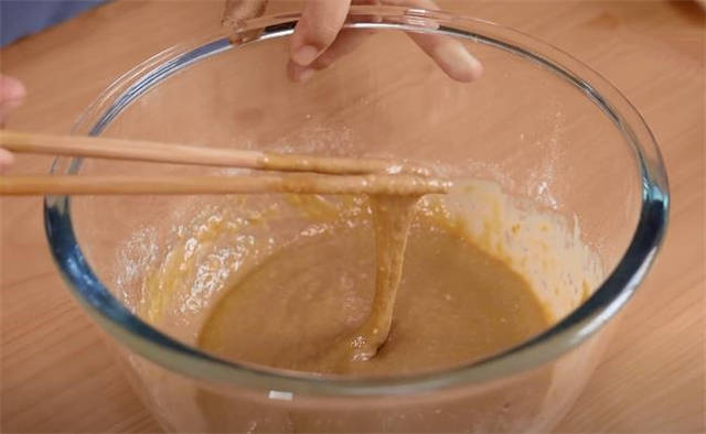 1.普通面粉放160g,50g的红糖,这里酵母粉一定要用耐高糖的,放上3g,和面的时候我们直接用120毫升温水,搅拌面糊的时间尽量长一点,一定要把里面的疙瘩搅开,搅成这种粘稠的程度就可以了。