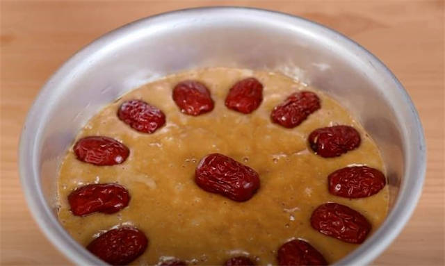 4.大概有40分钟左右,这个面糊已经发酵的很好了,不需要额外的排气,直接在上面放上红枣。