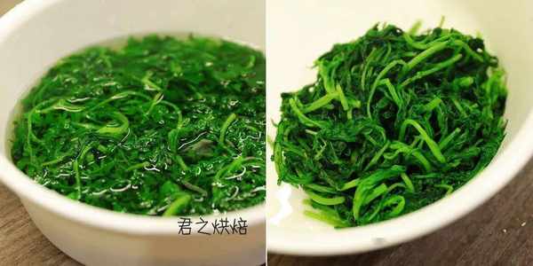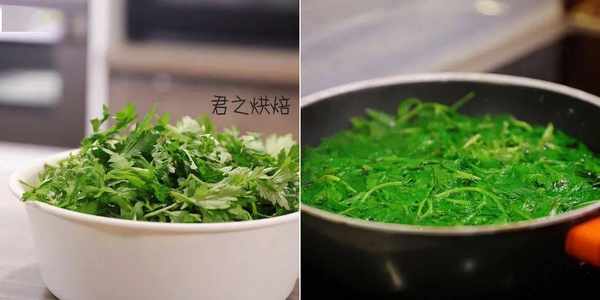 煮过的艾草捞出来,用清水洗3遍。最后用手握住艾草挤一挤,将水适当控干。