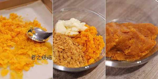 咸蛋黄冷却以后,用勺子背压碎。压成细细的粉末状。