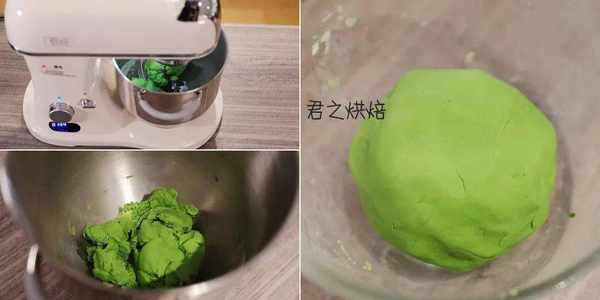 也可以用厨师机来操作。糯米粉、糖、猪油倒入搅拌盆。君焙厨师机G1/L1的话,倒入艾草汁以后用4档揉3-5分钟,加入澄面面团以后继续4档揉3分钟即可(A5/A6型号用1档,5分钟+5分钟)。