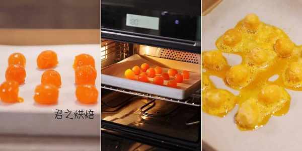 一共需要12个生的咸鸭蛋黄,放入铺了油纸的烤盘里。烤箱预热至上下火180℃。放入烤箱中层,烘烤8-10分钟,烤到咸蛋黄流油。