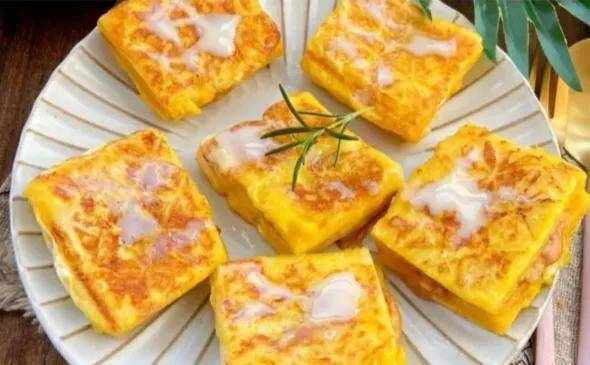 2:吐司均匀蘸满蛋液,三明治机刷油