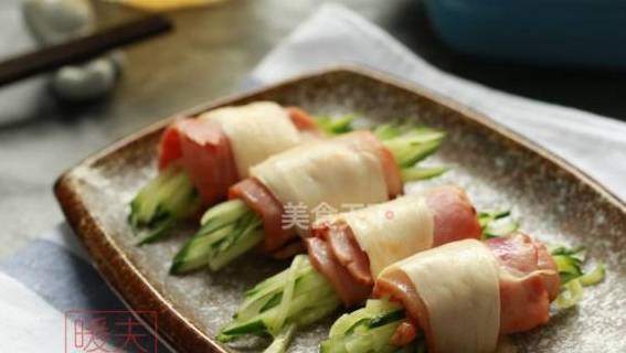 杏鲍菇培根卷的做法步骤:5先用培根卷紧黄瓜丝