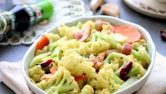 培根炒花菜的做法步骤:8加入焯过水的花菜和胡萝卜翻炒