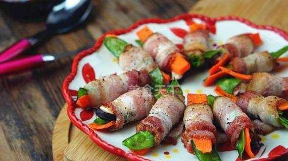 三蔬培根卷的做法步骤:4备半条培根,将三款时蔬卷在里面。