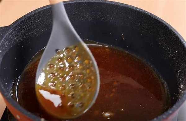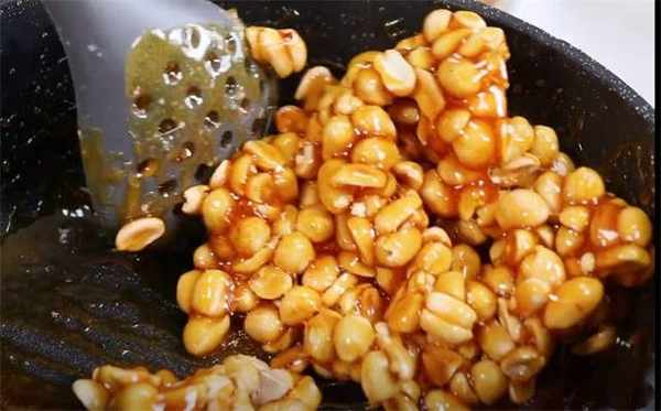 3.熬糖稀只需要用到白糖,等把糖稀熬到琥珀色的时候就可以放花生了。