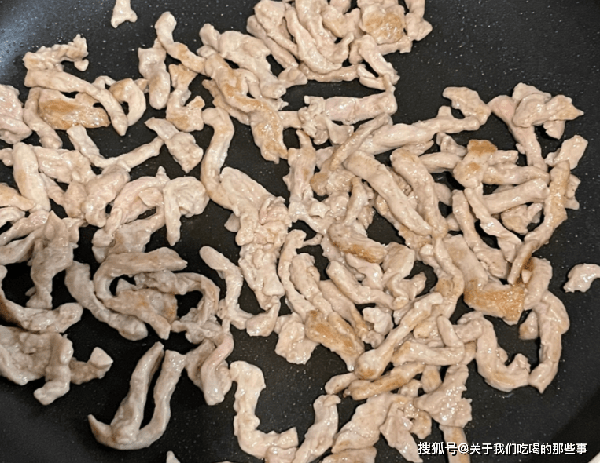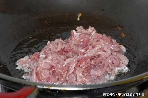 小火把油温烧至四成热,倒入腌好的肉丝,用铲子快速滑炒,让肉丝散开。等到肉丝变色后即可捞出。用四成热炒肉,肉炒熟时油温已经有六七成热了。