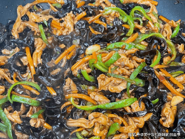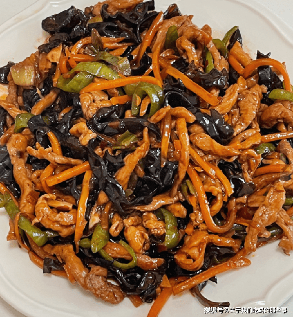 ③起锅烧油,四成热时放入腌好的肉丝,小火滑炒至变色,盛出备用。锅里留底油,放入葱姜蒜爆香,加一勺豆豉炒出豉香味,倒入木耳、胡萝卜,大火翻炒至断生。