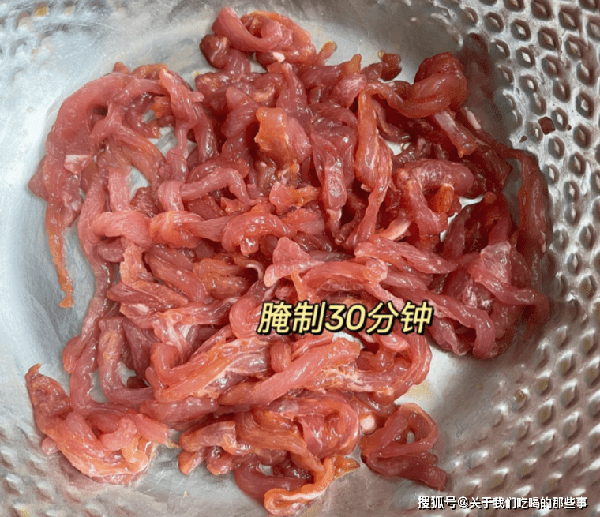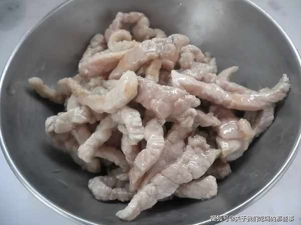 做法:①里脊肉洗净切丝,加入适量食盐、生抽、料酒、蚝油抓匀,打入一个蛋清,放入一勺淀粉、一勺油,用手抓匀后腌制30分钟。