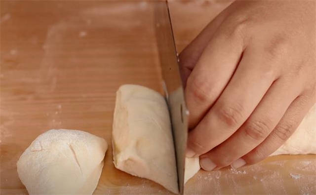 2.面团饧好之后我们先简单的揉两下,再撒些干面粉防粘,揉到不粘手的状态之后我们直接搓成长条,再切成小面剂。