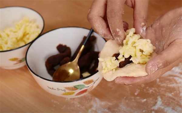 4.中间的位置填上豆沙馅,想要再好吃一点可以放一些芝士碎。