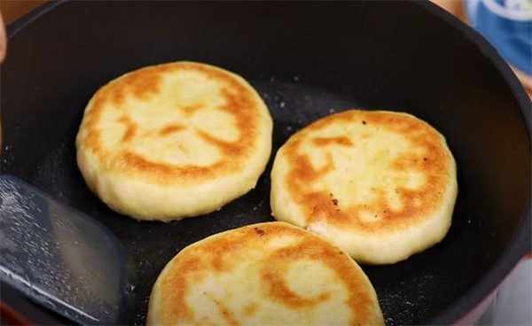 7.大概两分钟左右饼子已经膨胀了,这时候我们来翻面,持续烙到完全鼓起,而且按压可以回弹的程度就可以出锅了。