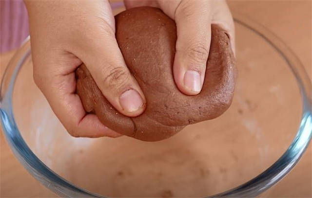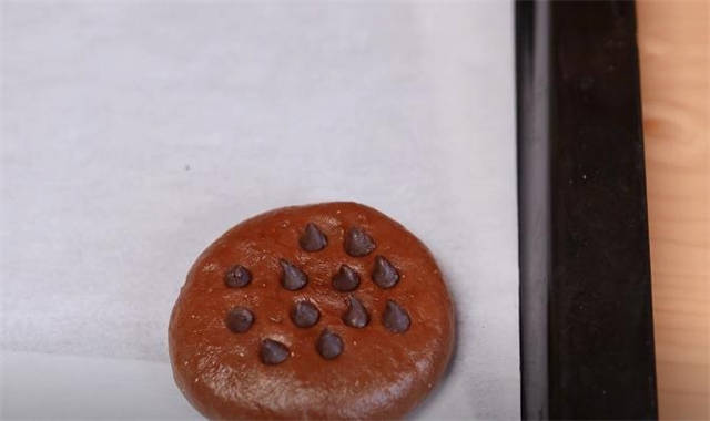 2.做这个饼干不需要过多的揉面,我们用虎口处掐出来一个小面剂,里面包上一些巧克力馅,这样可以形成一个爆浆的感觉。