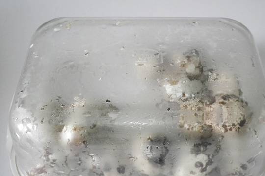 将保鲜盒盖扣好,上下左右用力摇晃几下,让鹌鹑蛋在里相互碰撞。