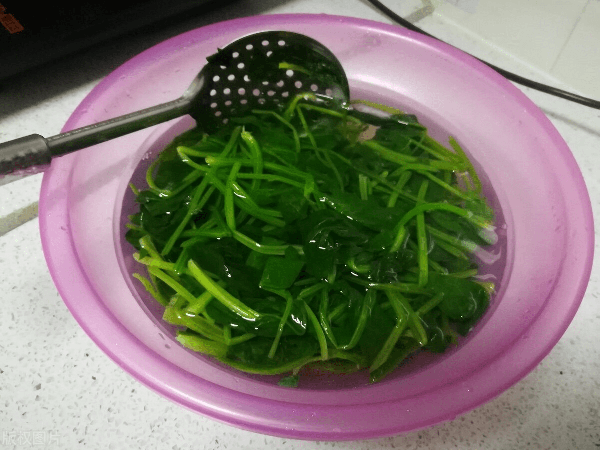 2.起锅烧水,加入一小勺食盐,少许食用油,将菠菜下锅焯水,焯软捞出。