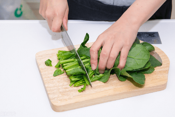 1.菠菜洗净后浸泡半个小时,控水捞出切成小段。起锅烧水,加入一小勺食盐,少许食用油。