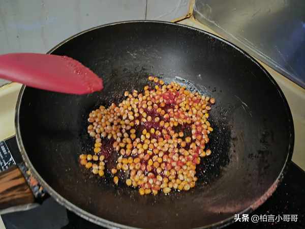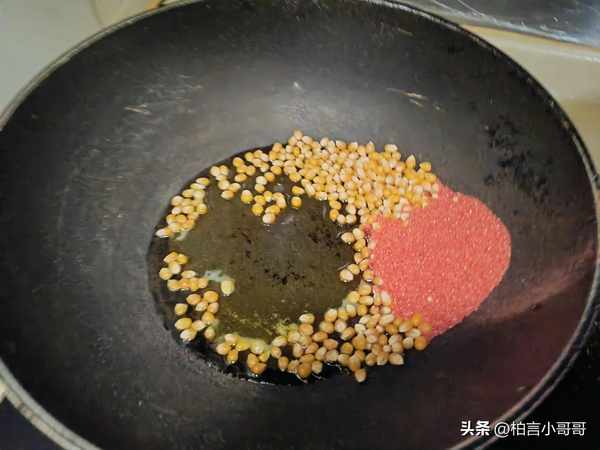大约2分钟时间油已滚热,开始有玉米爆裂成爆米花,此时为了防止爆米花爆出锅外,可以将锅盖盖上。然后一边加热一边摇晃锅,防止某些玉米被炒糊。