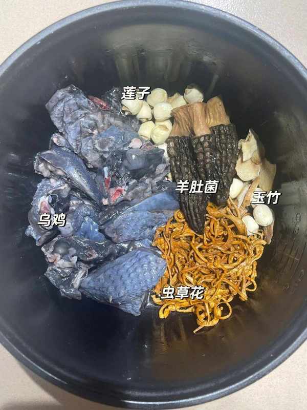 材料:乌鸡、羊肚菌、虫草花、玉竹、莲子、盐。