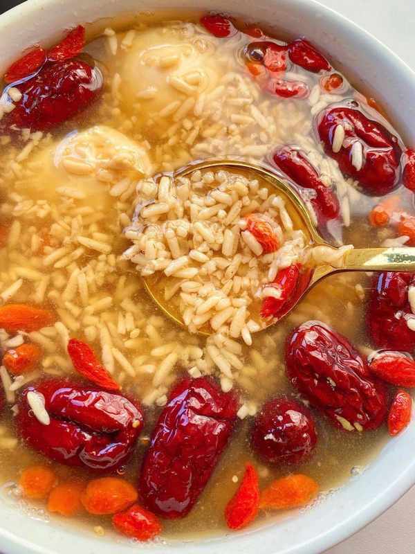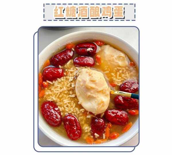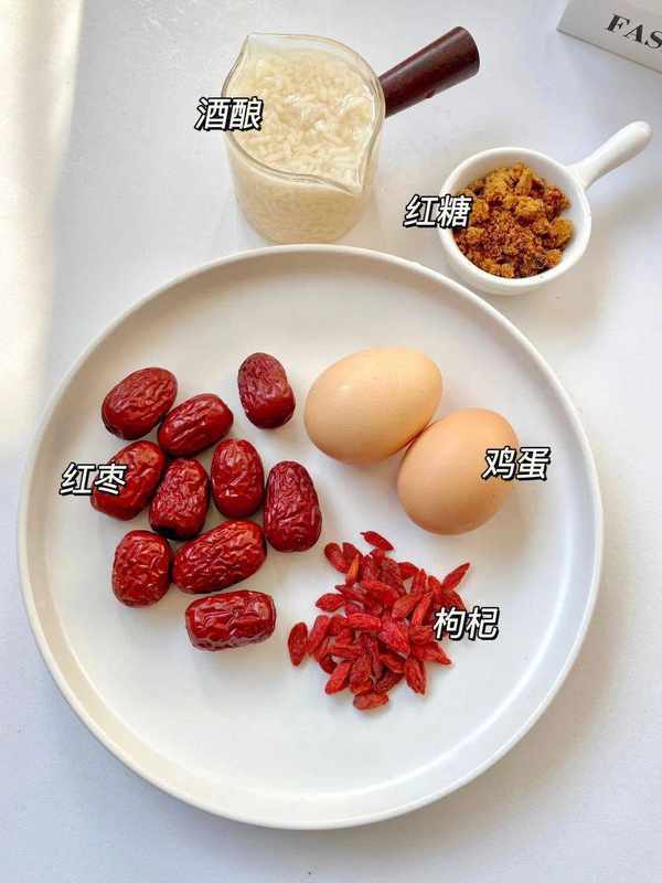 材料:红枣、枸杞、酒酿、鸡蛋、红糖。