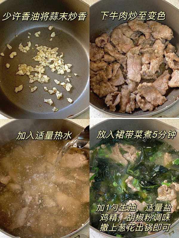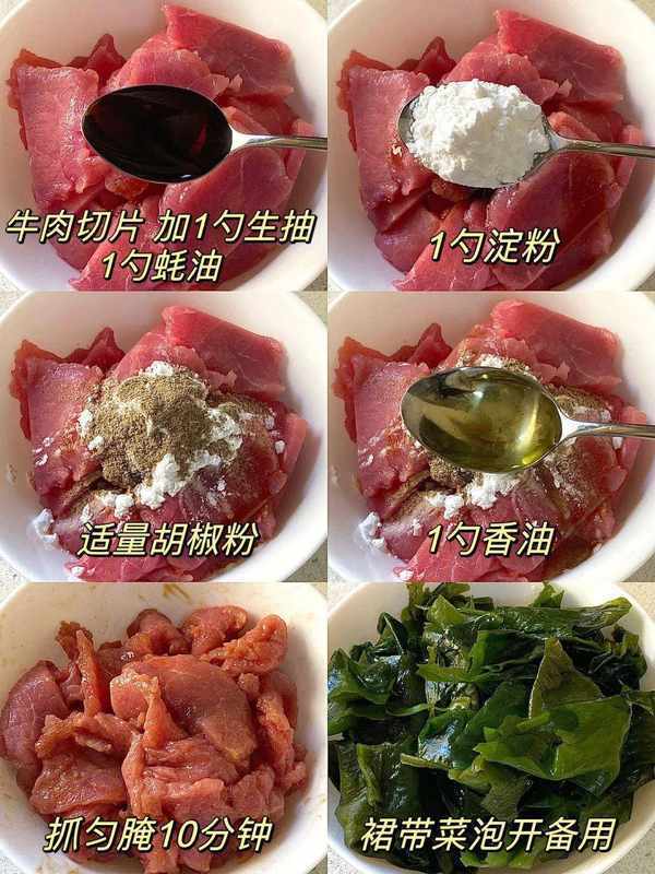 材料:牛肉、裙带菜、淀粉、胡椒粉、香油、蒜、盐、鸡精、葱。