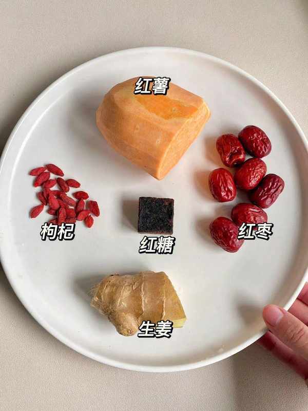 材料:红薯、红糖、红枣、枸杞、生姜。