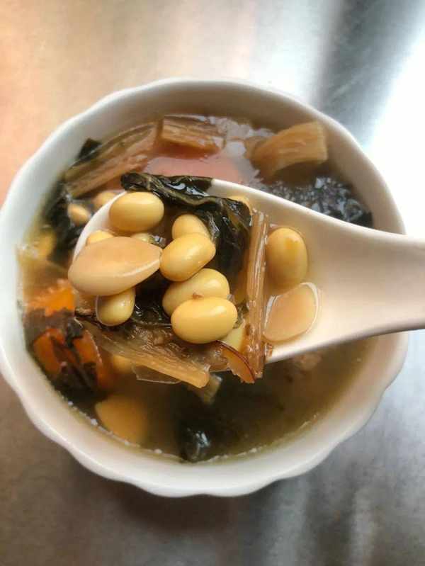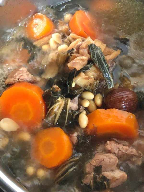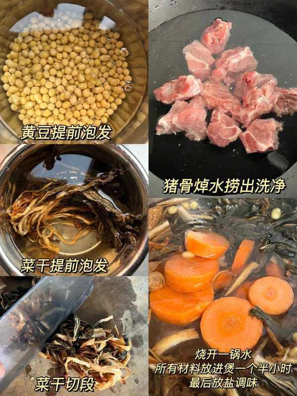 材料:猪骨、白菜干、胡萝卜、蜜枣、南北杏、黄豆、姜