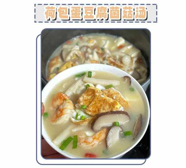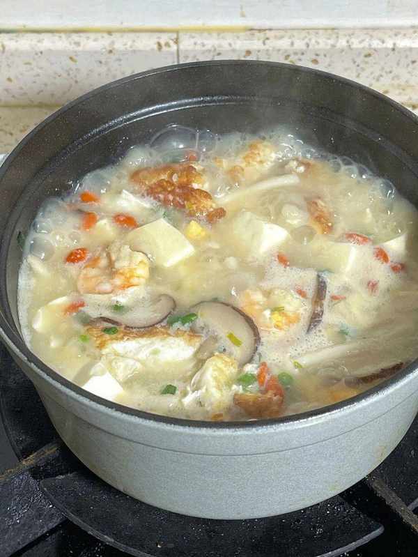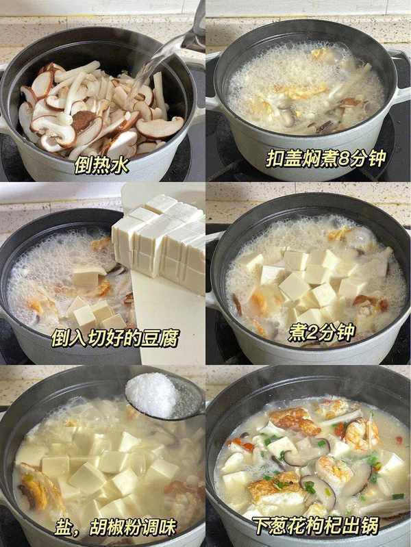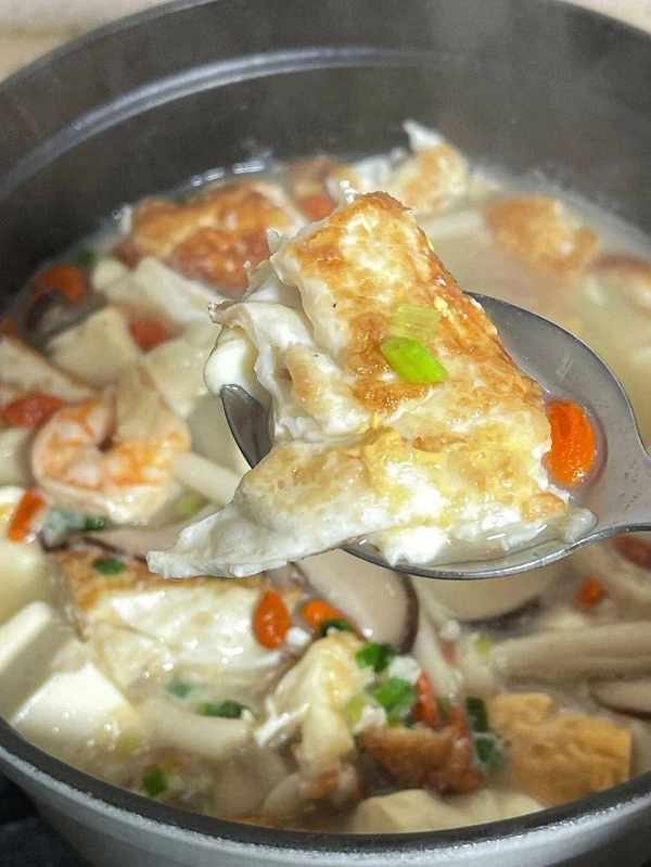 材料:嫩豆腐、白玉菇、香菇、虾、鸡蛋。