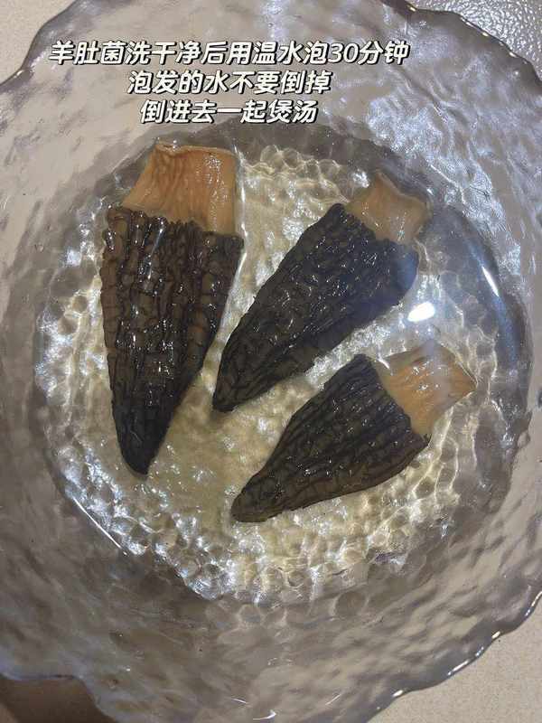清洗羊肚菌,然后用温水泡发半小时,泡发后的水不要倒掉,可以用来煲汤!